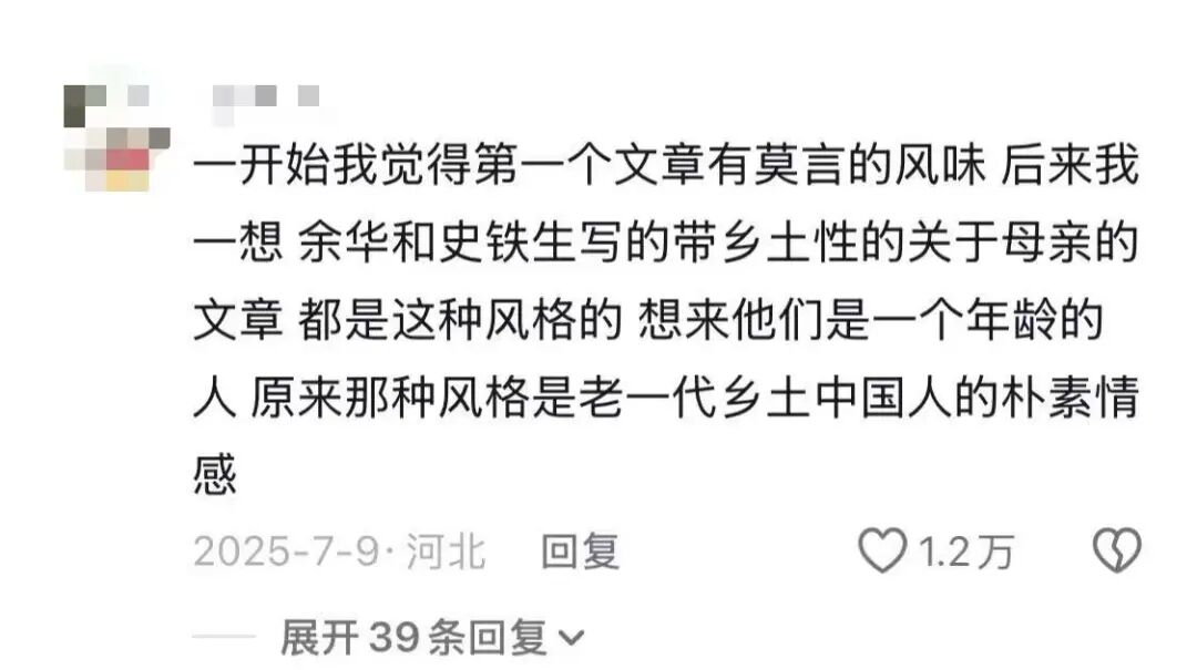 评论区里,有人这样说:“一开始我觉得有莫言的味道,后来一想,余华、史铁生写母亲,其实也是这种风格——原来这不是文学技巧,这是老一代乡土中国人的朴素情感。”