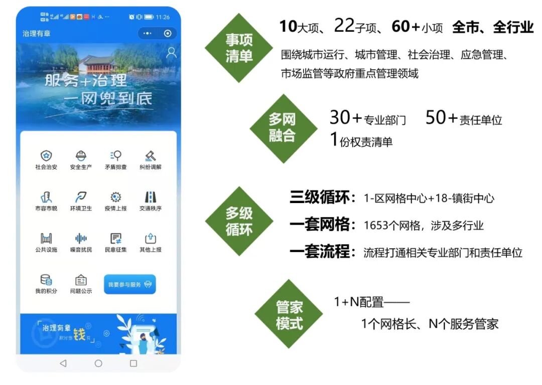 章丘一网通管项目:党建引领下的一网通调、社会协同下的一体联动、群众参与下的一屏智享的社会治理体系,重点融合城市治理多专业网格,梳理城市管理服务清单,管理服务下沉到基层,建立区中心、网格、镇街中心、村居网格三级循环处置,创新网格管家治理模式,实现全民互动参与城市治理的“精准管+精细服”。