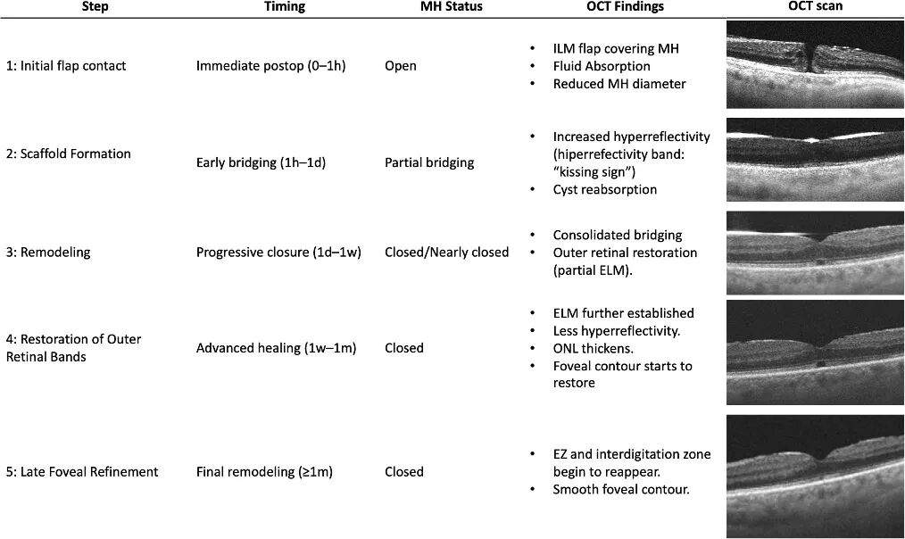3期:组织重塑。术后1周即可进入该愈合阶段,此时88%患眼已实现解剖学闭合。通过全域扫频OCT观察可见,随着裂孔边缘持续向中心靠拢,中心凹形态逐渐趋向更浅平、更对称的形态。ELM开始恢复,标志着组织不再仅仅是跨越缺损区域,而是开始重建视网膜各层的解剖结构完整性。