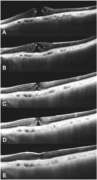 正是基于术后这一系列高清形态学发现,本研究提出基于全域扫频OCT影像的“裂孔闭合五期模型”(图5):