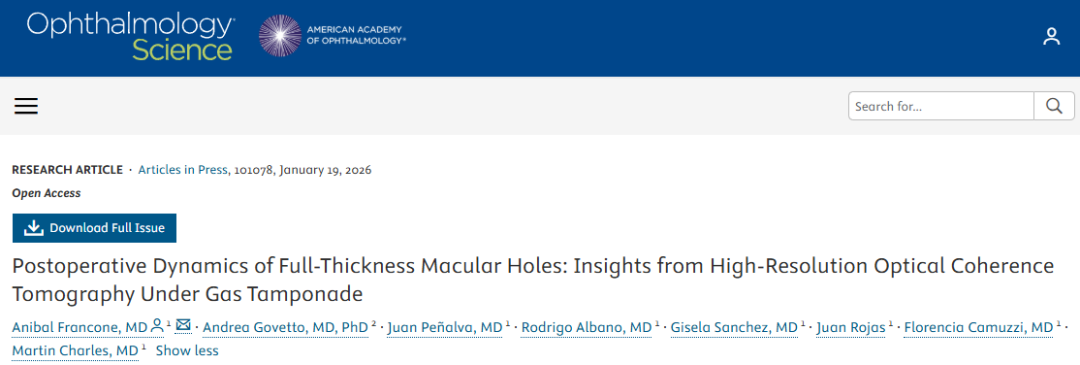 2026年新年伊始,一项发表在眼科高能级期刊《Ophthalmology Science》(影响因子4.6)的重磅研究赫然颠覆了传统黄斑裂孔术后管理模式!这项由阿根廷Charles眼科中心Martin Charles教授团队Anibal Francone医生主导、意大利Andrea Govetto教授共同协作的研究,首次利用中国图湃40万次全域扫频OCT北溟·鲲,克服了玻切术后眼内气体填充严重干扰传统OCT成像的难题,实现了对黄斑裂孔术后早期气下愈合过程的动态、高清观测,并提出黄斑裂孔闭合的“五期模型”,揭示了颠覆传统认知的现象,大部分病例的解剖学闭合发生在术后24小时-1周的“黄金窗口期”,以全域扫频OCT下生物标志物引导的个性化术后管理或可成为新趋势!