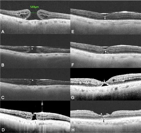 图3 全域扫频OCT下黄斑裂孔ILM瓣翻转覆盖术后早期形态学愈合过程。A. 术前全层黄斑裂孔。B. 术后5分钟,气液平面下ILM瓣在位。C. 术后俯卧1h。D. 俯卧24h后,孔径显著减小,ILM瓣在位,孔缘可见少许高反射增生组织。E. 术后48h, 裂孔处桥接组织清晰可见。F术后1周,视网膜外层缺损进一步减小。G术后1月,眼内气体吸收,高反射桥接组织清晰可见,并可观察到ELM开始重建。H. 术后2月,裂孔完全愈合,皱褶的ILM瓣留存在视网膜表面,ELM已恢复,仍可见椭圆体带一极小缺损(黑箭头)。