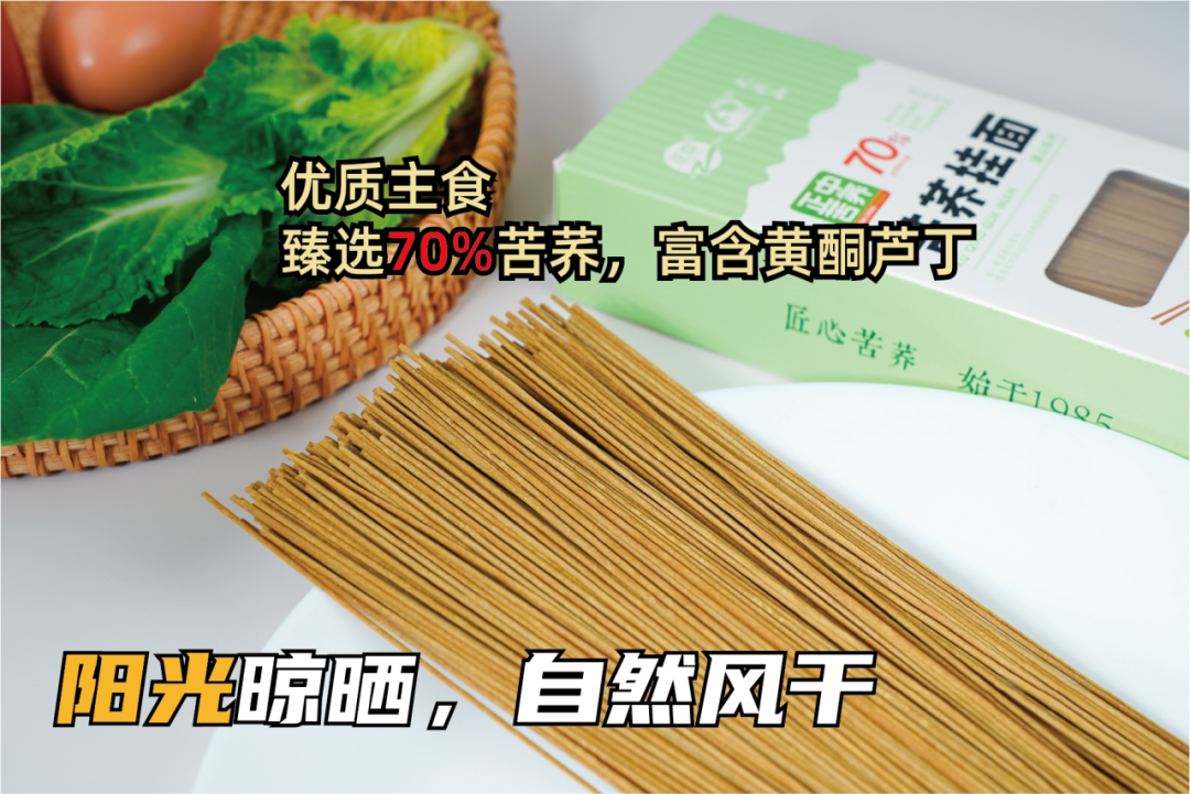 但这款面条不仅做到了“苦荞面不苦”,反而保留了十足的清香味。 它是通过阳光自然晾晒风干的,最大程度保留了芦丁和黄酮的活性。