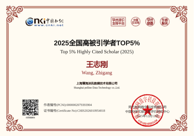喜报 | 王志刚先生蝉联2025年度“中国知网高被引学者TOP5%”