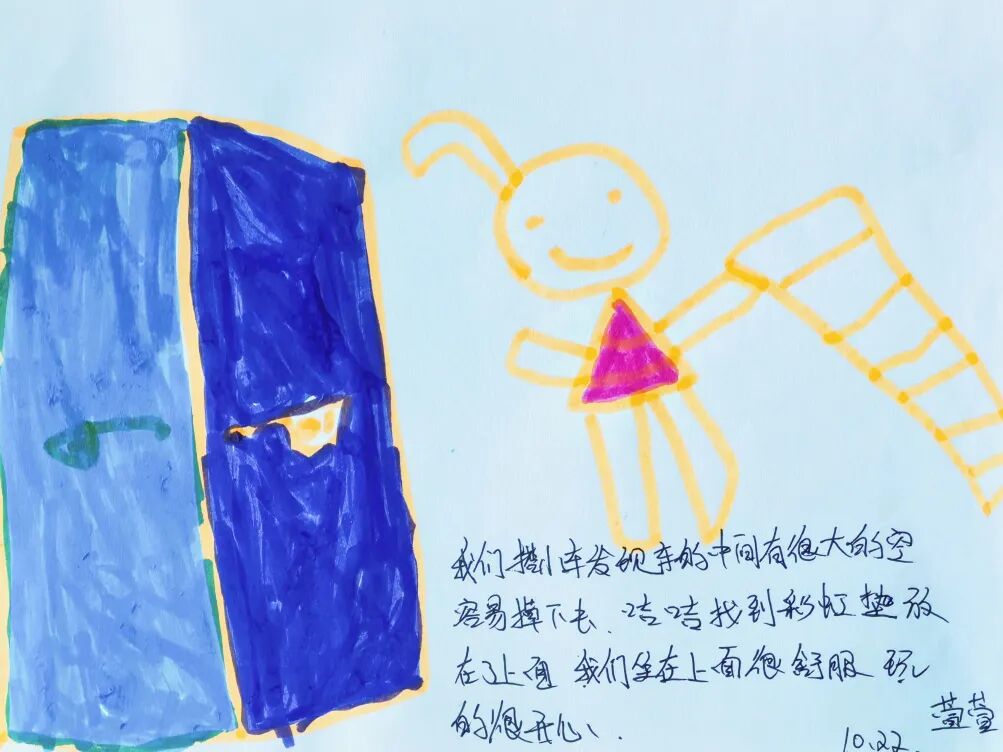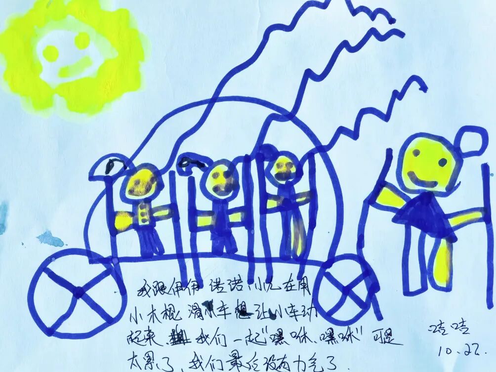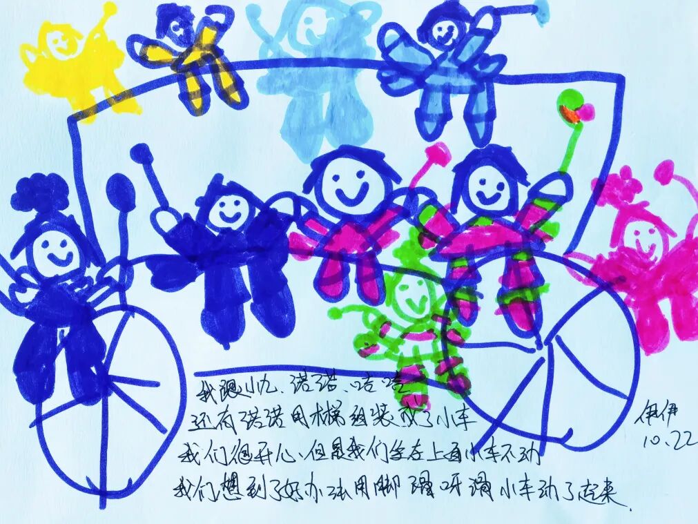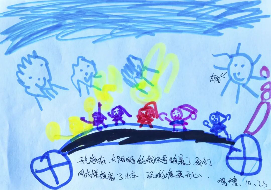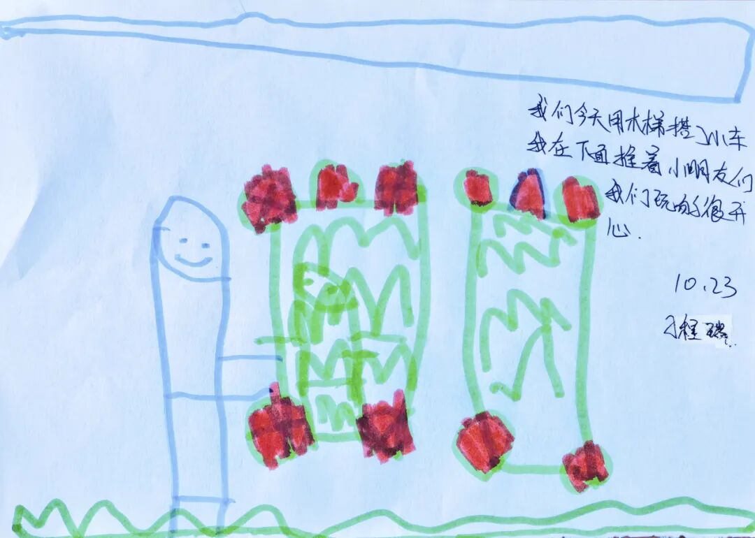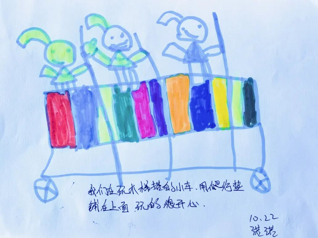 在本次游戏回顾中,我以轻松的小讨论形式,鼓励孩子主动表达与再现经验。我从引导者的角度出发,抛出开放式问题:“今天玩木梯小车,大家是不是遇到了好几件有意思的事儿?谁愿意来说说——我们搬木梯的时候、想让小车动起来的时候,还有挡住木板缝隙的时候,都遇到了什么小麻烦?最后又是怎么解决的呢?”孩子们你一言我一语,纷纷分享自己的经历。接着,我提供画纸和彩笔,邀请他们把刚才提到的“小麻烦”和“好办法”画下来——比如怎样一起搬木梯、怎么让车轮转起来等等。画完后,几位小朋友主动上台展示自己的作品,一边指着画面,一边讲述里面的故事。通过从说到画、再从画到说的过程,孩子们不仅清晰地回顾了游戏中遇到的问题与解决策略,也在表达中主动梳理了合作、安全与思考的经验,更为下一次游戏埋下了充满可能的种子。
