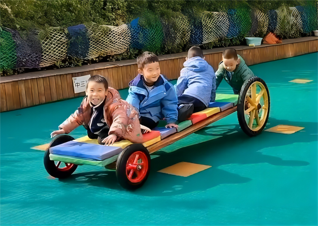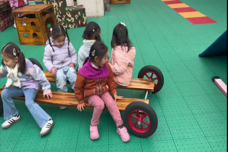 孩子们在游戏中自然地展现出解决问题的能力与探索的层次:他们通过“分工抬木梯”实现协作,用“板子卡住车轮”尝试固定——这是对“结构连接”的初步感知;通过“脚滑车轮”“木棍戳轮”来尝试推动小车,则是对“动力方式”的直观体验,虽然方法尚显费力且存在安全隐患;而“铺爬行垫盖住空隙”的行为,则流露出他们对“空间安全”的自发关注。我从中更清楚地看到,幼儿的学习正是发生在游戏与交往的每一步里。因此,我没有急于给出“正确答案”,而是把问题留给他们,让尝试继续、让困难发生,再通过适时的提问,引导他们自己观察、比较与调整——从而让本次的游戏经验,自然延伸为更深远的探索。