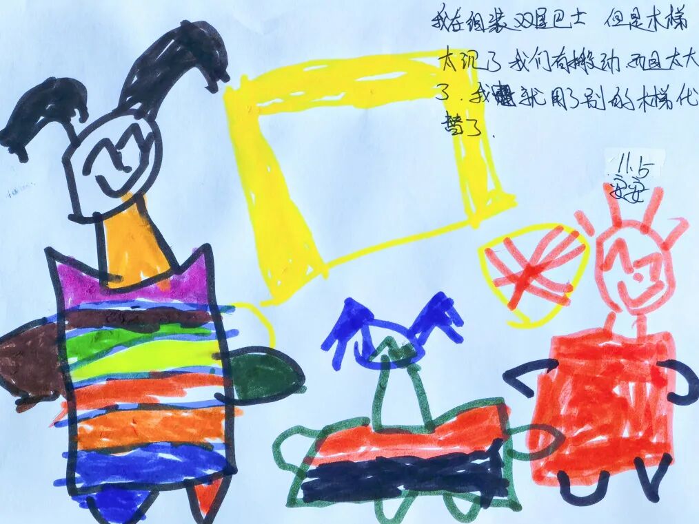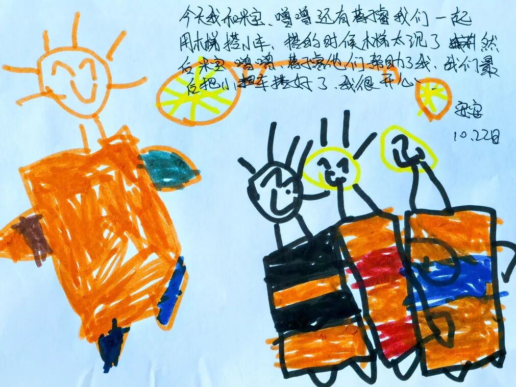 孩子们纷纷举手,你一言我一语地分享起来。随后,我们通过“分享+绘画”的方式,不仅让搭建小组的孩子完整回顾了从“遇到材料难题”到“灵活替换材料”的搭建过程,也让全班一起学习了“替代材料”“分工合作”的好方法。更重要的是,整个过程中孩子们乐于分享、敢于表达的积极性被充分呵护,大家对下一次游戏的创意延伸也充满了期待。