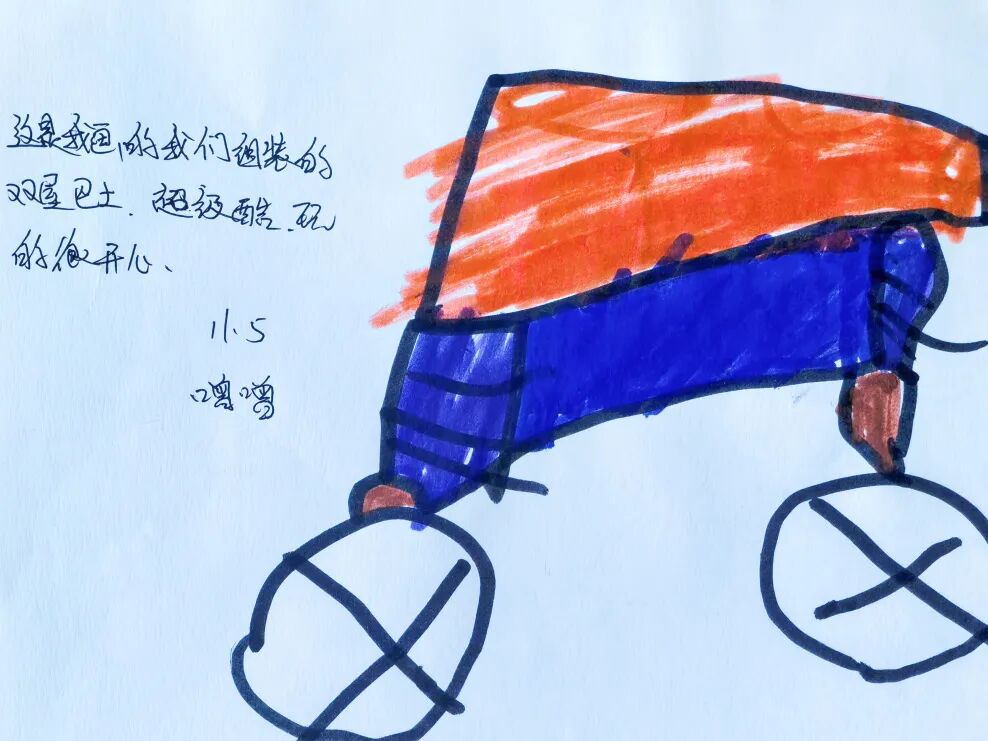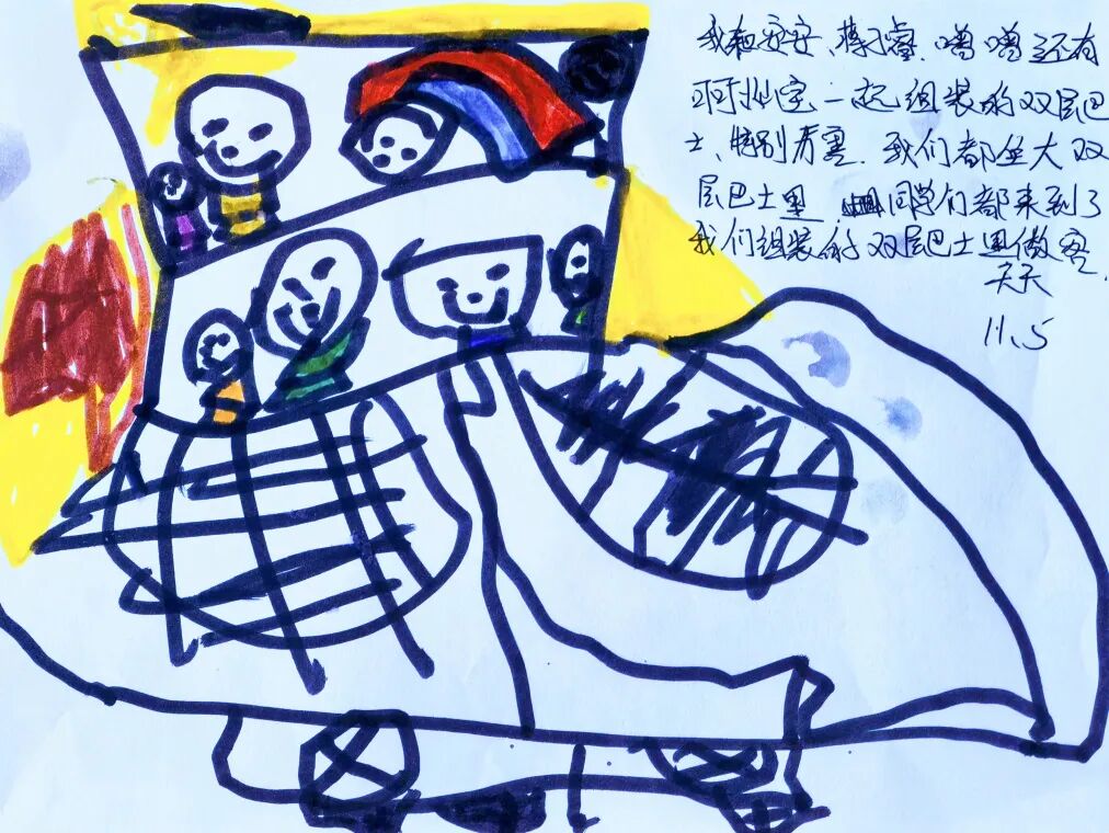 随后,我拿出画纸和彩笔,鼓励孩子们把“让小车更好玩的办法”或心里想搭的“双层巴士”画下来。孩子们兴致勃勃地动起笔来——有的画起了轮流推车的热闹场面,有的描摹出了高高的双层巴士。画完后,几位孩子主动向大家展示自己的作品,一边指着画面一边讲述自己的想法。这样的分享,既自然地回顾了游戏中的经验,也小心呵护住了他们心中那份正在萌发的创造愿望。