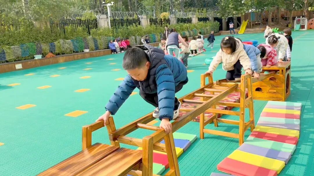 幼儿园的新成员——户外木梯刚刚投放,就成了孩子们眼里的“宝藏”!游戏时间一下子就热闹了起来。米宝和安安把木板架在木梯上,搭成了一条“闯关赛道”。他们还从身边找来爬行垫、彩圈、滚筒等材料,不断地创新游戏的玩法。