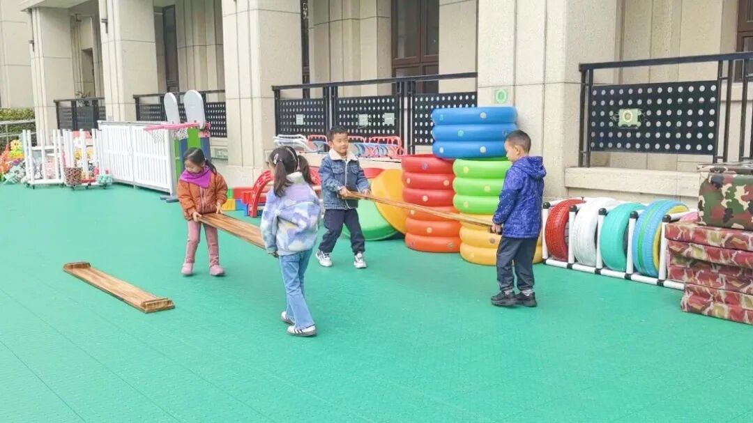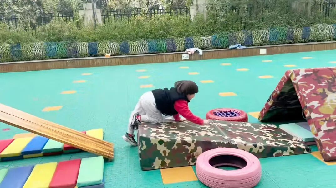 米宝和安安指着旁边的爬行垫喊道:“咱们把这个铺上去!”孩子们一起拖来爬行垫,铺在两块木板上——空隙被盖得严严实实。