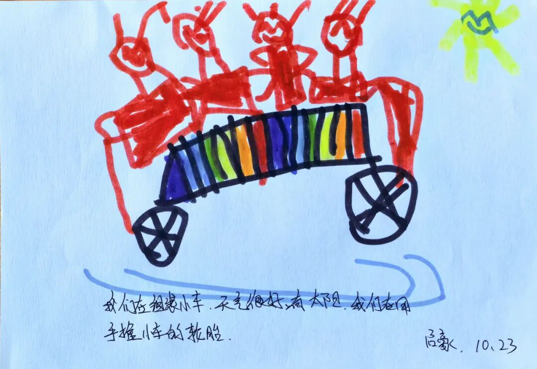 是用手推车毕竟费力,推了一会儿,启豪的胳膊就酸了,小手也被硌得有点疼。他停下来喊道:“换个人推吧!”于是孩子们一起商量,决定“一个人推一段,轮流下车来帮忙”。就这样,你推一会儿、我接一段,小车终于能顺畅地向前“跑”起来了。