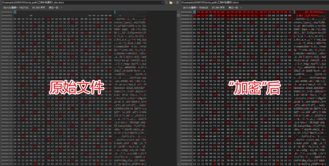 对比原始文件与被加密后文件的内容,其异同也印证了我们经代码分析梳理出的加密逻辑。