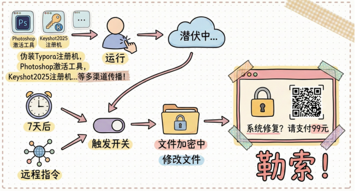 近日,一款伪装性极强的勒索软件在网络中悄然蔓延。该软件被我们命名为“MiddCrypto”,其通常伪装成Typora注册机、Photoshop激活工具、Keyshot 2025注册机等常用软件的破解补丁进行传播。