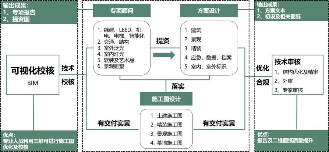 本项目在管理上采取效果类一体化设计与方案施工图一体化设计模式,通过组织各专业多次现场踏勘,各个专项设计在概念设计阶段提前介入进行方案可行性论证,并由主创设计师进行整体效果和设计把控,过程中涉及效果的内容包括外立面、幕墙、内装、景观、夜景照明、导示标识等均进行总体思考,总体设计,保障既改项目在管控中的效果统一、品质效果还原度,成本和时间计划高度集约,形成一条完整的综合性效果类控制主线。在项目推进过程中,多专业协调,高效的工作模式与各专业之间的深度配合。在保证效果的同时,避免了较多不合理的设计,极大地缩短了项目的时间成本。