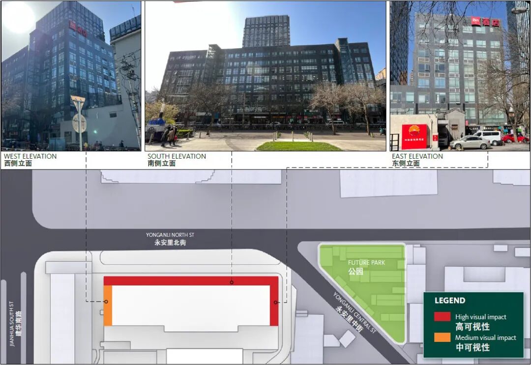 北立面与东立面是影响建筑形象的主要立面,西侧是建外大街到达方向看到的主要方向,但是底部被前方的酒店所遮挡。