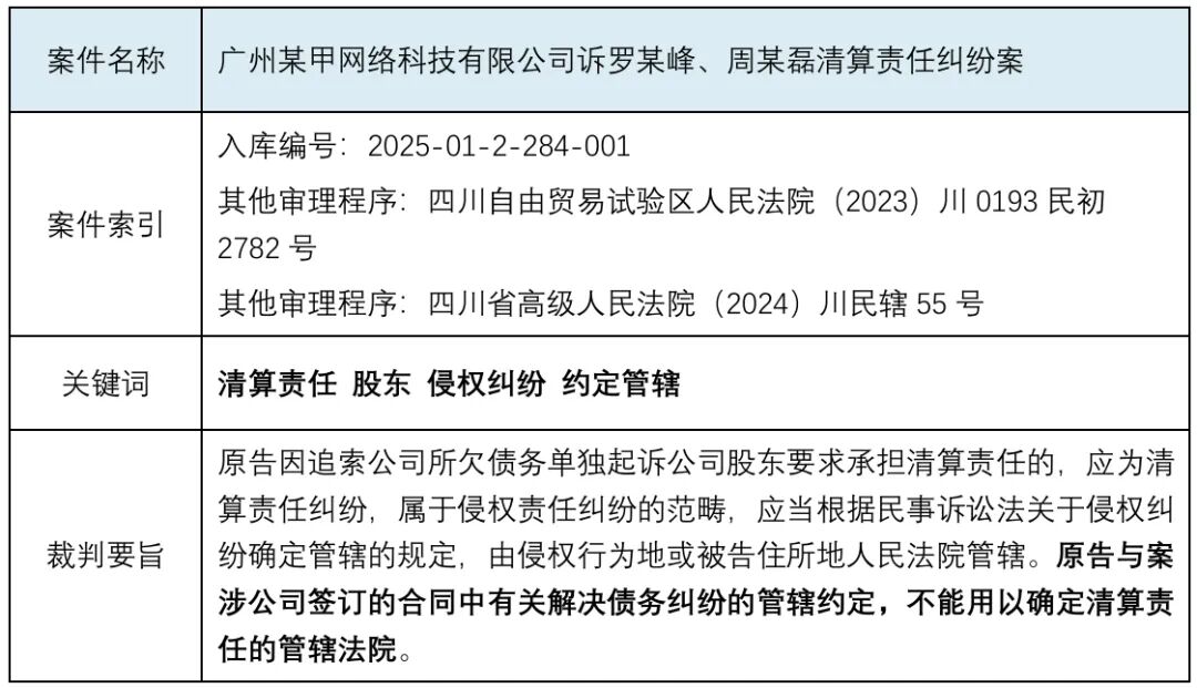 2025年,新增入库案例共8件,包括:损害公司债权人利益责任纠纷、清算责任纠纷各新增2篇,请求变更公司登记纠纷、公司解散纠纷、股东知情权纠纷、与公司有关的纠纷各新增1篇。即,2025年度新增入库案例更多地关注了新《公司法》实施后大量产生的损害公司债权人利益责任纠纷、清算责任纠纷等。