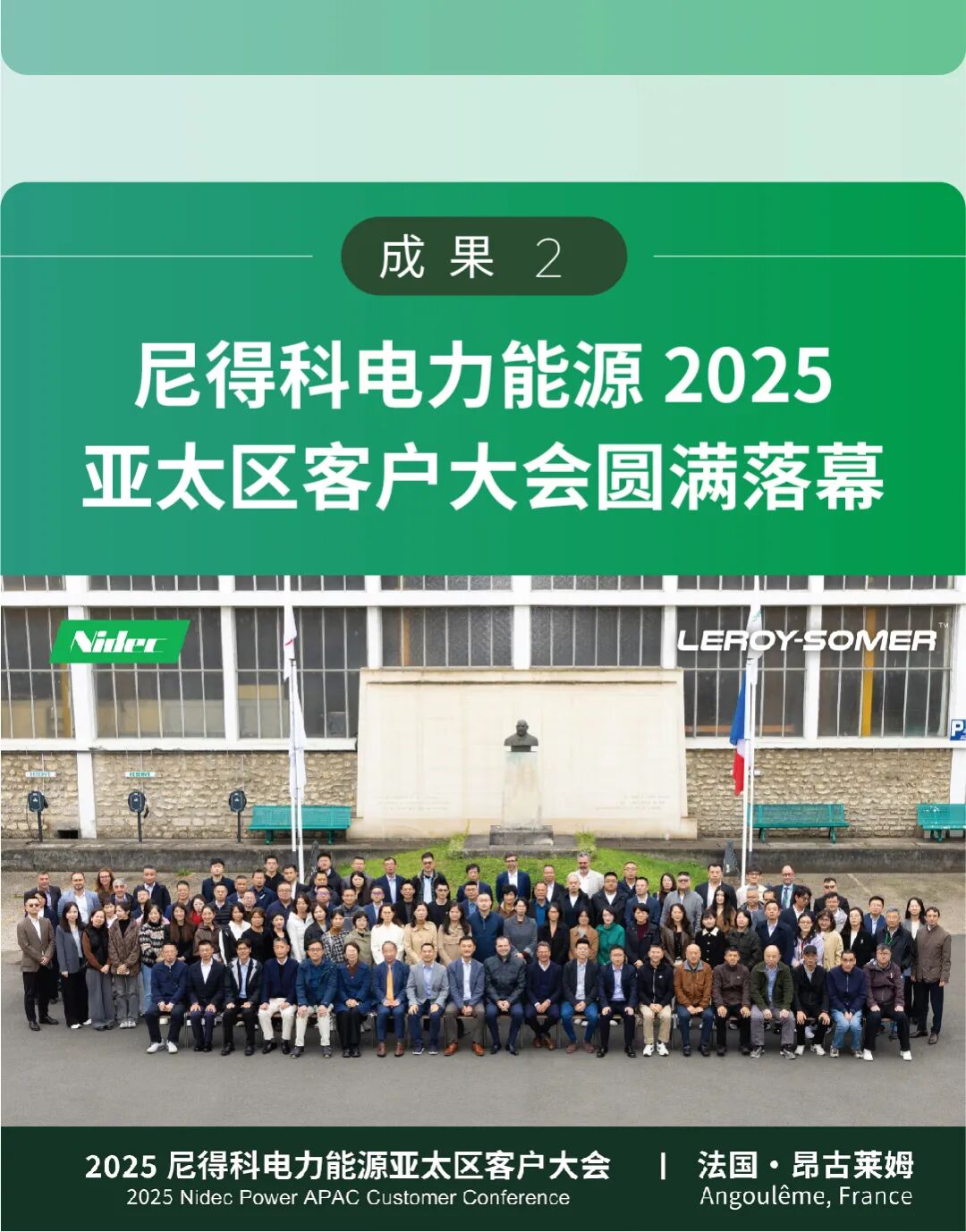 从中国工厂攻坚克难、按期交付的储能项目,到法国昂古莱姆传承匠心、共谋发展的客户大会,这两项成果是尼得科运动&能源事业本部技术实力与企业承诺的生动注脚。它们共同印证了我们的核心信念:真正的可持续发展,不仅源于前沿的技术与可靠的产品,更源于与客户及伙伴之间的信任。