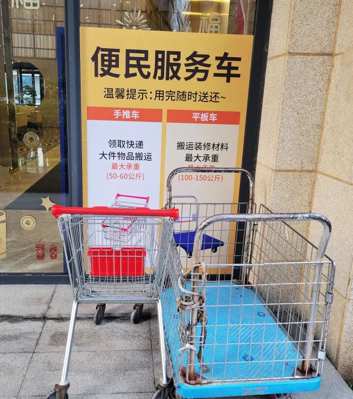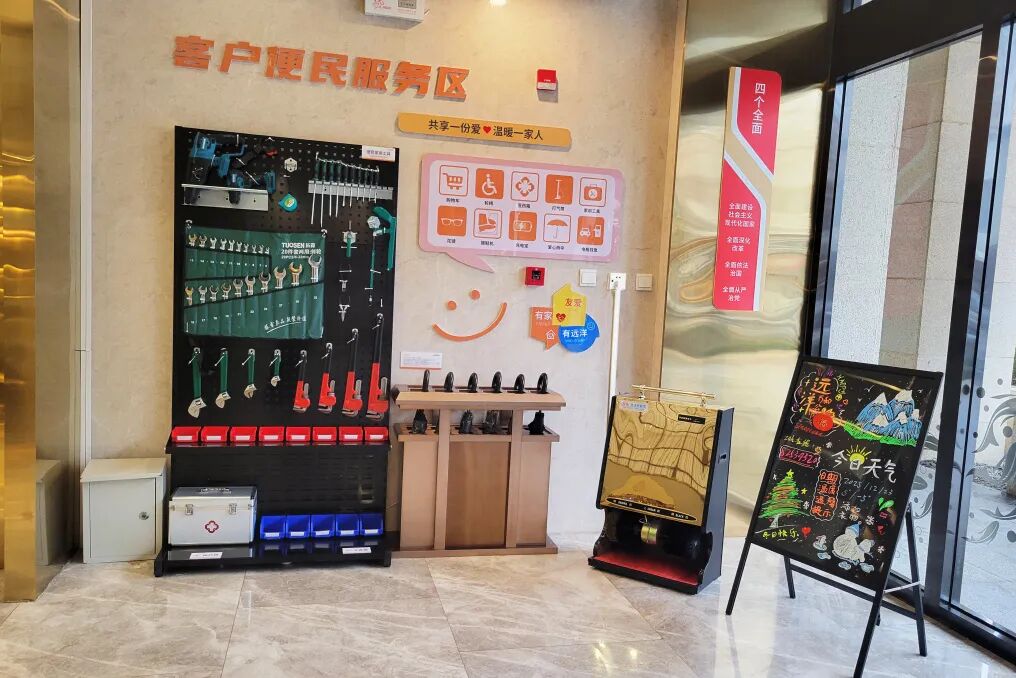 打气筒、维修工具、雨伞、擦鞋机、手推车、天气预报牌等实用物品一应俱全。不管是自行车补气、临时需维修工具,还是雨天忘带伞,这里都能及时解忧,让便利融入日常。