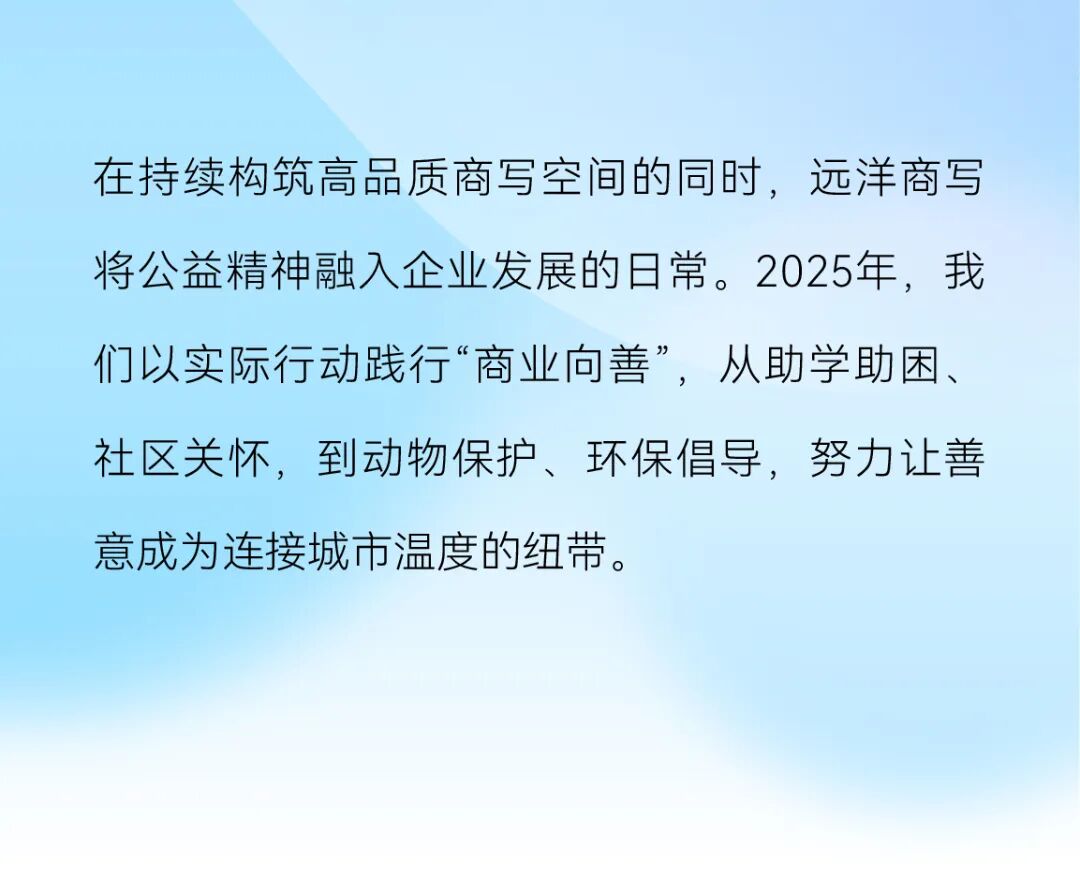 远洋商写愿以持续、真诚的公益行动,连接社群,温暖城市,让善意如静水深流,浸润日常。