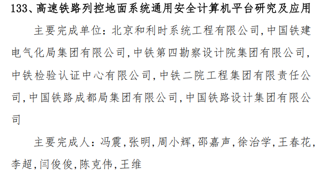 “高速铁路列控地面系统通用安全计算机平台研究及应用”项目成果由和利时牵头,联合中国铁建电气化局集团有限公司,中铁第四勘察设计院集团有限公司,中铁检验认证中心有限公司,中铁二院工程集团有限责任公司,中国铁路成都局集团有限公司,中国铁路设计集团有限公司共同完成。
