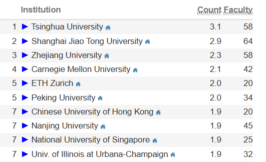 ■ 同样也有在“四大世界大学排名”和CSRankings中均表现优异的院校,如我国的清华大学、北京大学、上海交通大学、香港大学,美国的卡内基梅隆大学、伊利诺伊大学厄巴纳-香槟分校、加州大学伯克利分校,新加坡国立大学、南洋理工大学,瑞士苏黎世联邦理工学院等。