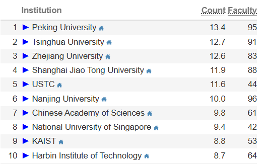 中国院校表现尤为亮眼,包揽该领域前七名。其中,北京大学今年超越清华大学,登顶全球榜首;浙江大学排名亦有所上升。新加坡国立大学与韩国科学技术院也是前十中除中国院校外仅有的两所海外院校,分列第8、9名。