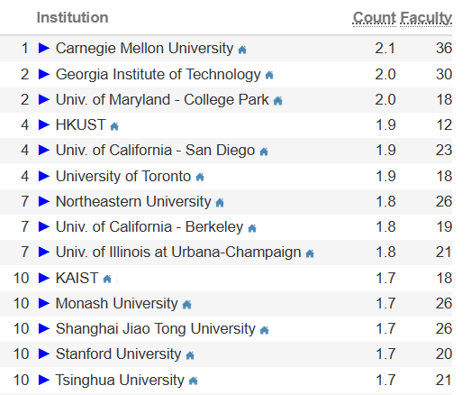 ■ 从近年的CSRankings中可以看出,韩国科学技术院、美国马里兰大学帕克分校、佐治亚理工学院等高校在计算机科学领域的发展颇为稳定,排名稳居全球TOP15。