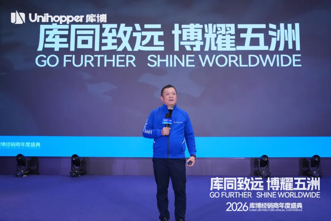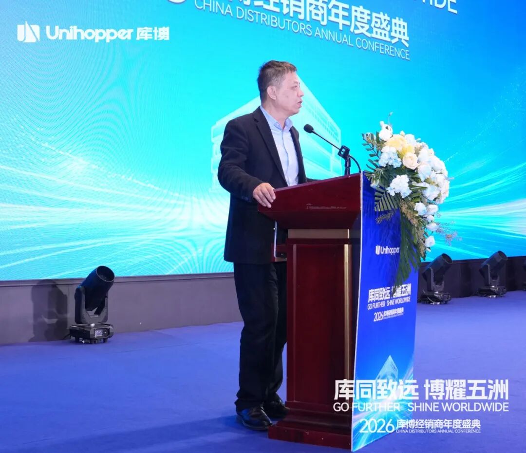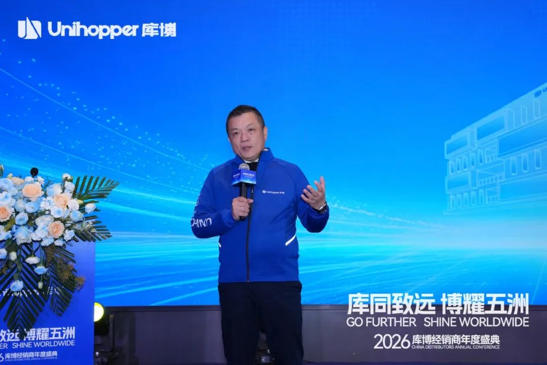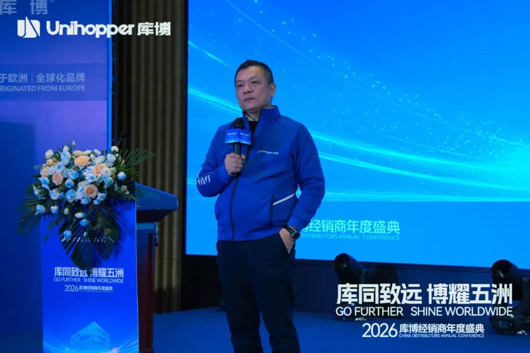 Unihopper库博集团董事长兼总裁潘晟先生在开幕致辞中,回顾了库博在复杂经济环境中逆势增长、稳步拓展全球市场的奋进历程。他特别肯定了集团在全球化业务拓展、经销商数量增长、以及整体业绩攀升等方面取得的扎实成果。