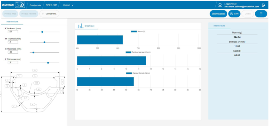 在自行车轮圈设计应用中,产品设计工程师可以通过Web界面调整轮圈截面的各种参数,如壁厚、形状轮廓等。每次参数调整后,系统会在几秒钟内返回预测结果:新设计的重量、刚度、应力分布,以及基于材料选择的成本估算。工程师还可以使用优化功能,设定多个目标(如“在刚度不低于某值的前提下最小化重量”),系统会自动找到最优的设计方案。