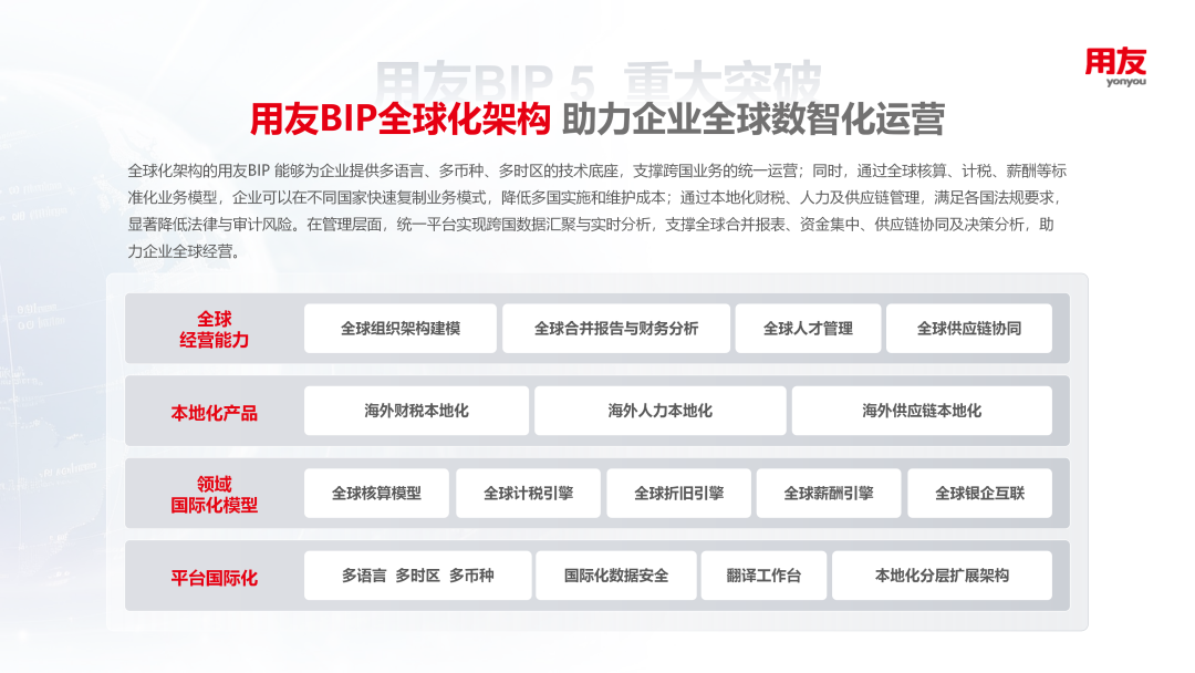 面对全球化企业多会计准则、多税制、多币种的复杂治理挑战,用友基于其新一代商业创新平台BIP,构建了领先的全球化智能财务能力体系。用友BIP财务全球化能力不仅体现为技术领先性,更在于其对企业全球化运营复杂性的深度理解与本土化实践的结合。平台通过“全球化标准+区域化适配”的双层架构设计,可有效实现“全球运营,本地智能”的数字化治理目标。