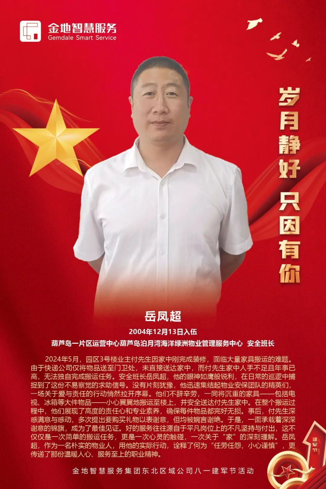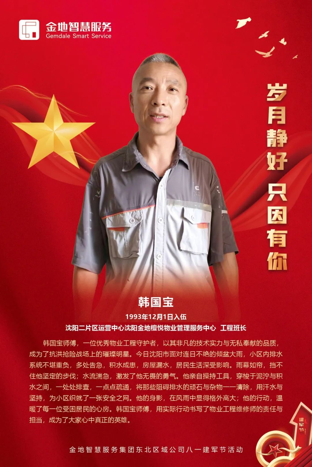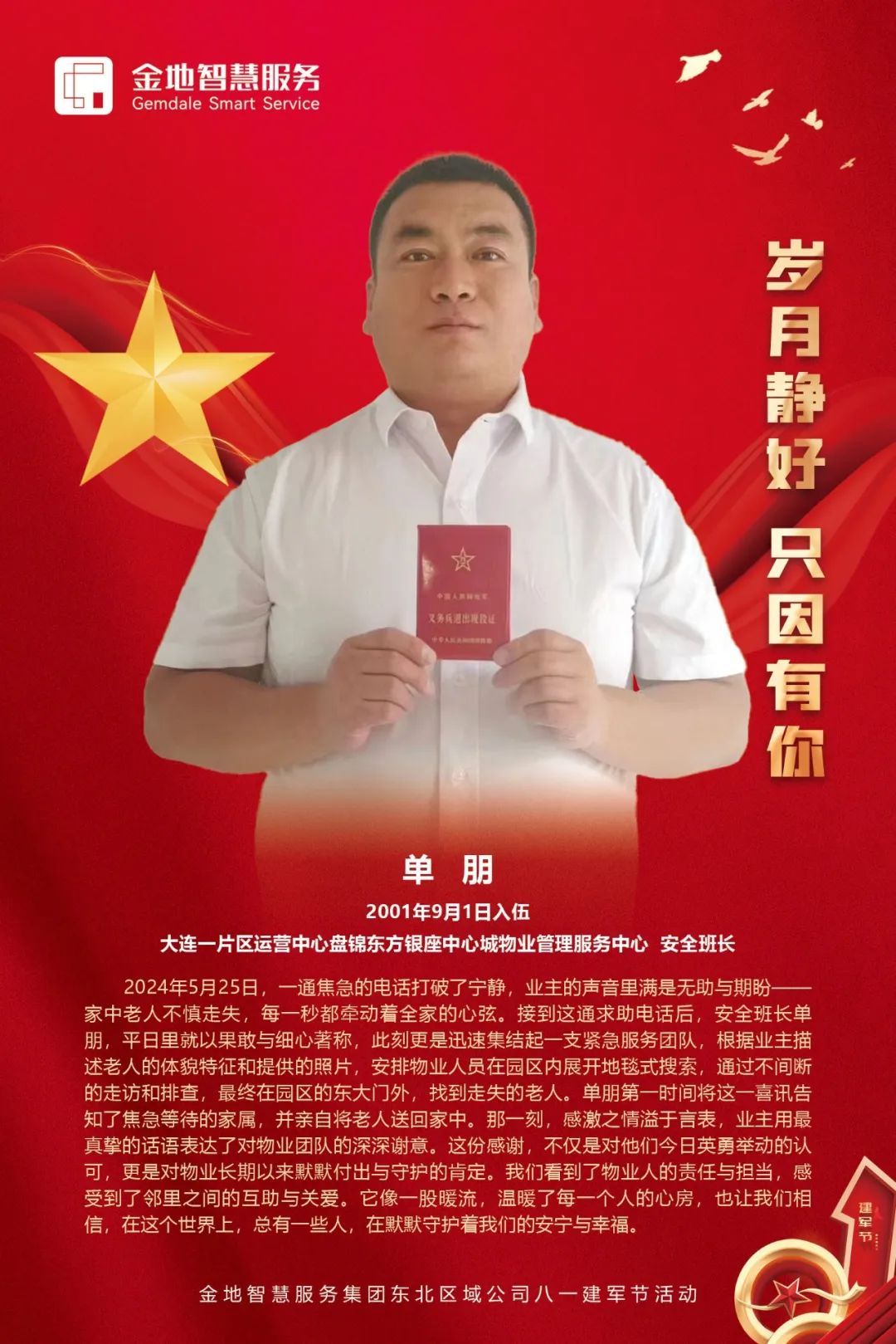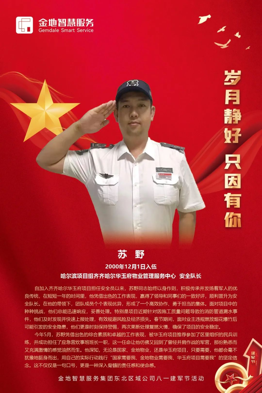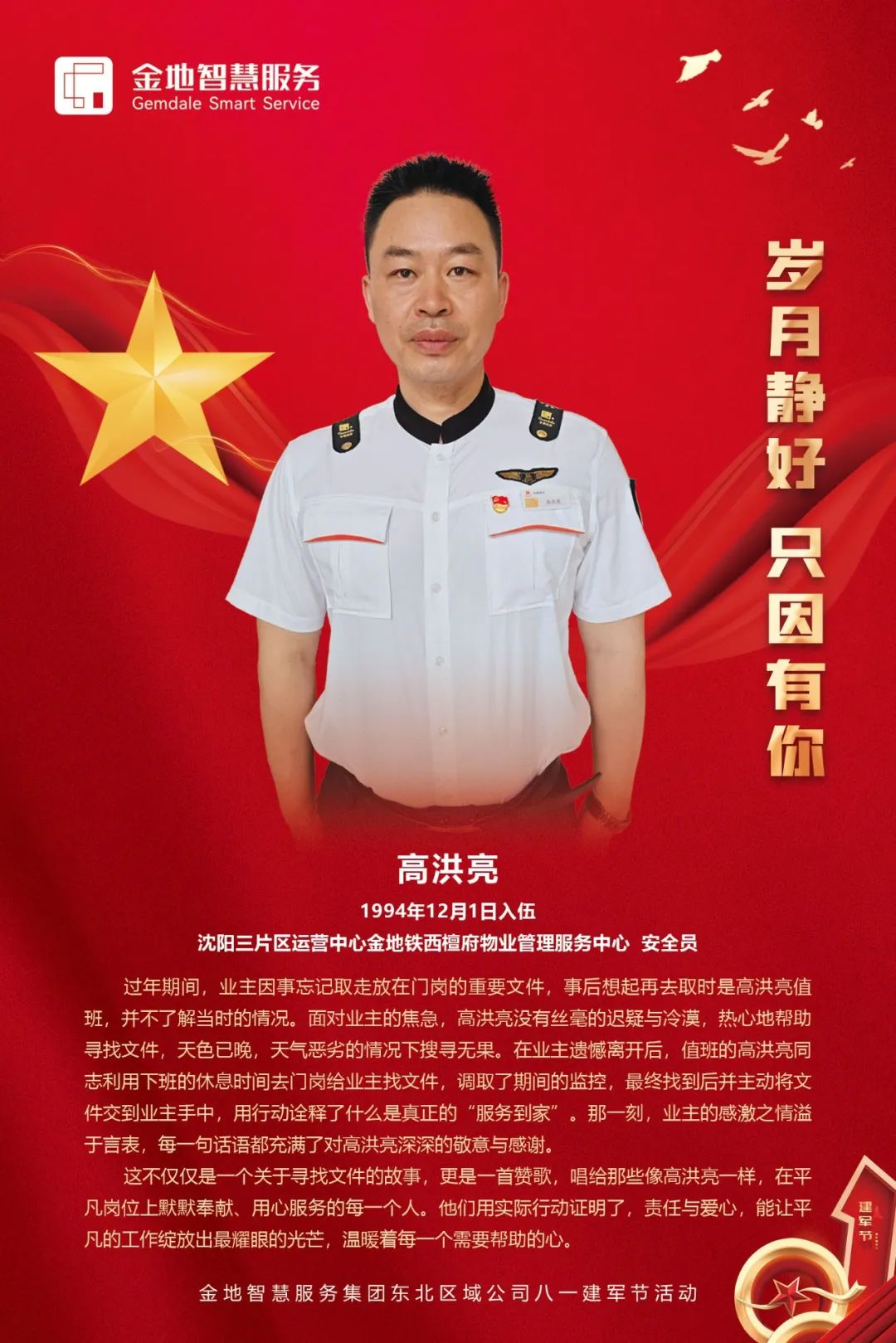 这些军人模范不仅是公司的骄傲,更是我们传承军人精神、弘扬正能量的重要力量。他们用自己的行动证明了,无论身处何地、从事何种职业,只要心中有爱、肩上有责,就能书写出属于自己的精彩篇章。在未来的日子里,金地智慧服务将继续发扬这种精神,鼓励更多员工向他们学习,共同为打造更加安全、和谐、美好的社区环境而努力。