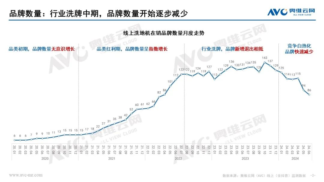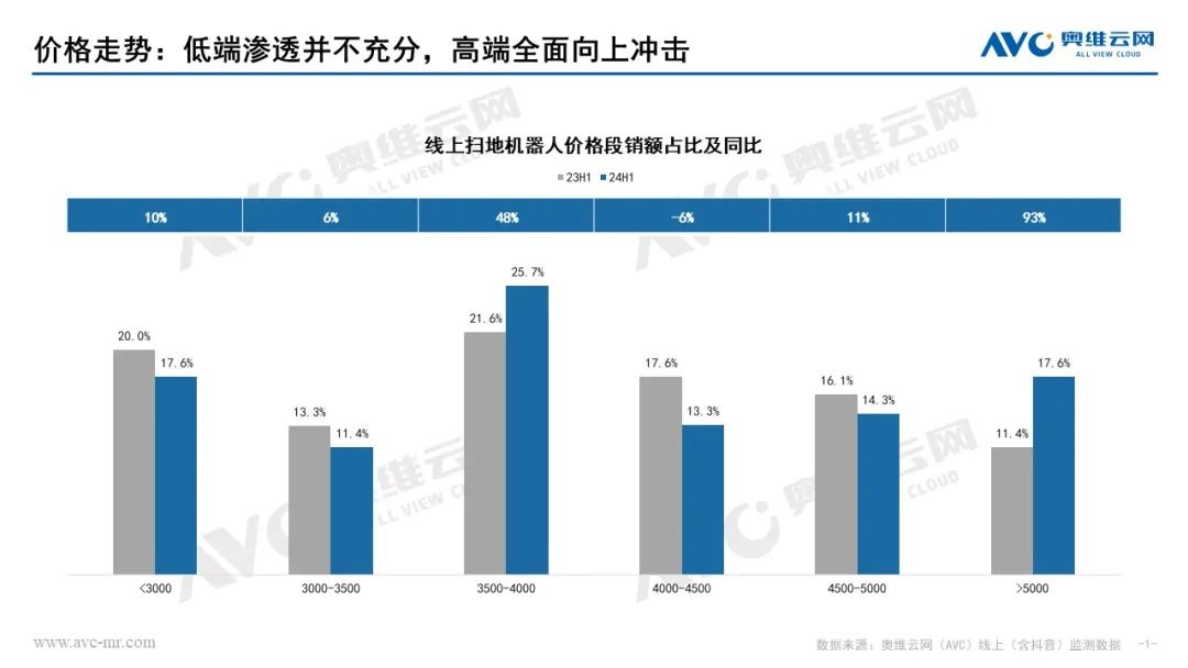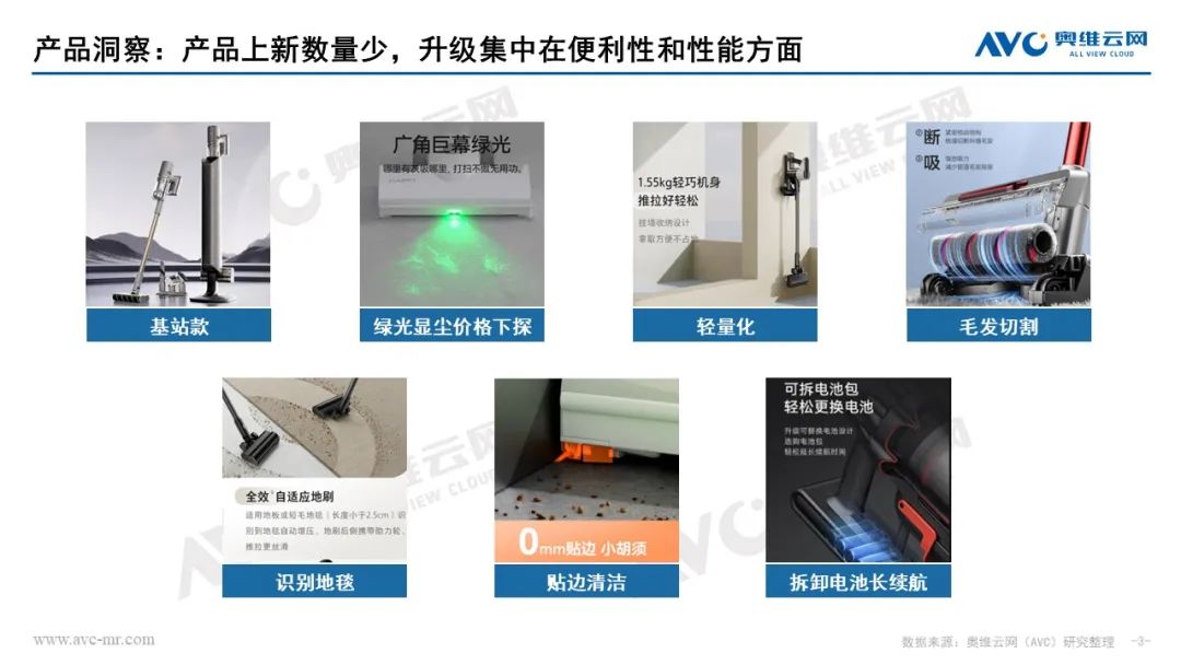 奥维云网(AVC)推总数据显示,2024上半年扫地机器人在整体清洁电器内部占比达到41%,稳坐清洁赛道头把交椅。整体来看,上半年新品上新步伐加快,品牌布局从单品到全价格段全覆盖,相较去年,头部品牌上半年发布新品数量远超去年同期,并且不再锚定单一价格,5000元左右的高端产品头部全部补齐,3500-4000元成为核心主力价格段,3000元以下价格段新品布局不是很多,更多的是老品价格下降。从产品端来看,聚焦几个方面:首先是性能在升级,最为明显的就是吸力方面,旗舰机型已经10000Pa起步;其次,针对用户痛点做进一步升级,比如毛发缠绕、热水洗拖布、双机械臂等;再次,AI大模型的应用,交互能力的提升;最后,从产品形态来看,无论是固态雷达,还是伸缩式雷达,高端旗舰产品都主打轻薄,与家居融合的嵌入式产品也都已经补齐。下半年,重点关注3000元以下价格能否放量。洗地机行业继续洗牌,内卷严重,价格战不止,叠加品类红利期消退,导致整体增速放缓,从增幅表现来看,上半年洗地机销额同比增长7.0%,但销量同比增长达到了24.2%。目前,洗地机行业进入白热化阶段,月度品牌动销数已经降不足百个,很多长尾品牌被淘汰。从细分市场来看,主要仍以单机款产品为主,占比达到88%,且线上均价已经下探到1950元,较去年同期下滑15.7%。从产品端来看,平躺、热水洗、快速烘干逐步成为标配,轻量化也是上半年主要做的一个方向。从产品形态来看,推入式产品、基站复合款产品等新形态给行业带来的新的东西,小型化基站同样是一个方向,但跟进品牌并不多,下半年看复合款和基站款能否有所发力。无线吸尘器品类下滑收窄,上半年较为突出的增长点是基站款形态,目前已经不足1500元,从产品端来看,无线吸尘器已经很长时间没有大的颠覆创新,行业集中在小幅迭代升级。带有绿光显尘技术的产品广泛应用,且价格已经来到几百元,轻量化、毛发切割、贴边清洁等,来更好的解决用户痛点,此外,针对续航时间,部分品牌推出了可拆卸电池,以此来延长设备使用时间。尽管无线吸尘器赛道相较扫地机器人和洗地机来说规模较小,但内卷并不是那么激烈,因为我们认为这一细分赛道仍值得关注。奥维云网(AVC)线上监测数据显示,2024上半年主流电商除螨仪销额同比增长仅为6.7%,抖音电商同比增长57%,受益于抖音电商拉动,除螨仪线上整体增长为22.7%。在抖音电商,我们看到部分品牌通过低客单、找达人、24小时不间断直播的方式,份额起的非常快,在行业起量后,吸引了众多品牌扎堆进入,品牌数量从2022上半年的102个增长到2024上半年的246个。从价格来看,去年都扎堆300-400元,今年上半年,价格有所下探,200-300元突围出来,增长显著,销额占比达到14.1%,100-400元是除螨仪主要销售价格段。从产品端来看,除螨仪接下来创新点较少,更多是围绕健康、高效、轻奢三大理念。我们认为除螨仪赛道较为小众,但短期内仍会有不错的增长。尽管上半年清洁电器整体增长不错,但考虑到去年走势以及当前的行业现状,下半年压力将会增加,因此我们预测2024全年清洁电器整体销额376亿元,同比9.2%,销量2885万台,同比13.8%。了解更多清洁电器市场数据