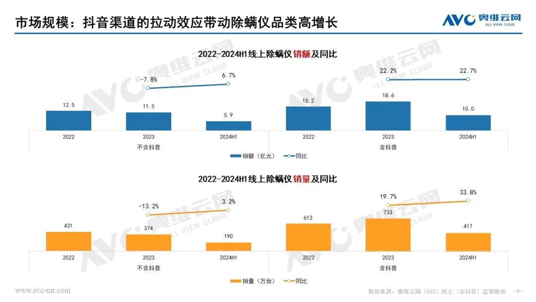 奥维云网(AVC)推总数据显示,2024上半年清洁电器销额165亿元,同比增长9.8%,销量1241万台,同比增长13.6%。具体来看,扫地机器人一马当先,上半年新品拉动效应显著,领跑清洁整体,销额销量均实现两位数增长,销额同比18.8%,销量同比11.9%,洗地机价格继续下探,销额增幅收窄,仅有7.0%,但销量同比达到了24.2%,无线吸尘器降幅收窄,销额同比下滑8.8%,销量下滑3.5%。此外,受益于抖音新渠道的拉动,除螨仪品类线上整体增长达到了22.7%。