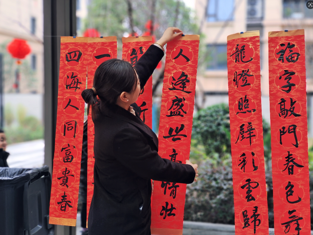 来到活动现场,为邻居们提笔写对联、剪窗花
