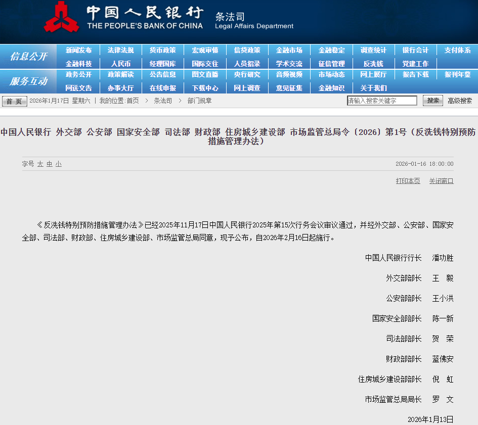 (转)央行、外交部、公安部、国安部、司法部、财政部、住建部、市场监管总局发布《反洗钱特别预防措施管理办法》