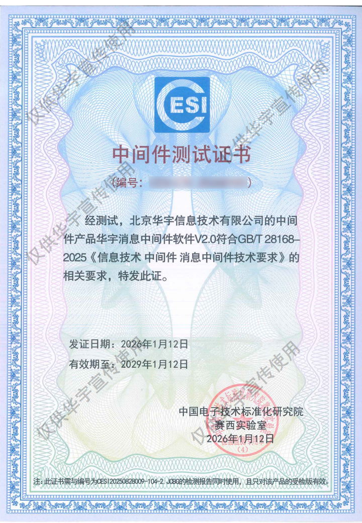 近日,华宇消息中间件成功通过GB/T 28168-2025《信息技术 中间件 消息中间件技术要求》国家标准测试,获得权威认证证书。该标准由国家市场监督管理总局、国家标准化管理委员会发布,于2025年11月1日正式实施,是衡量消息中间件技术水平的权威标尺。