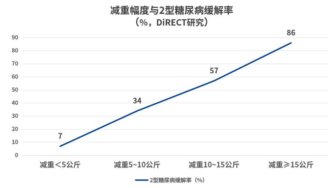 对于体重超标的2型糖尿病患者,当体重减轻5-10公斤时,糖尿病的缓解率会提升至34%。