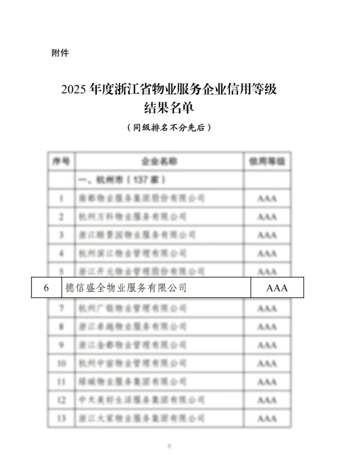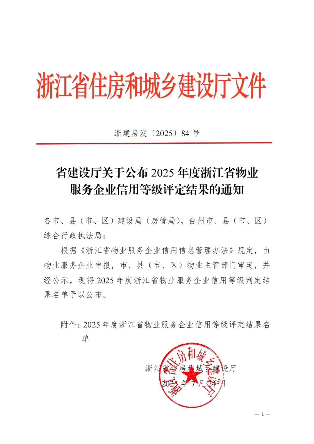 近日,浙江省住房和城乡建设厅公布2025年度浙江省物业服务企业信用等级评定结果。