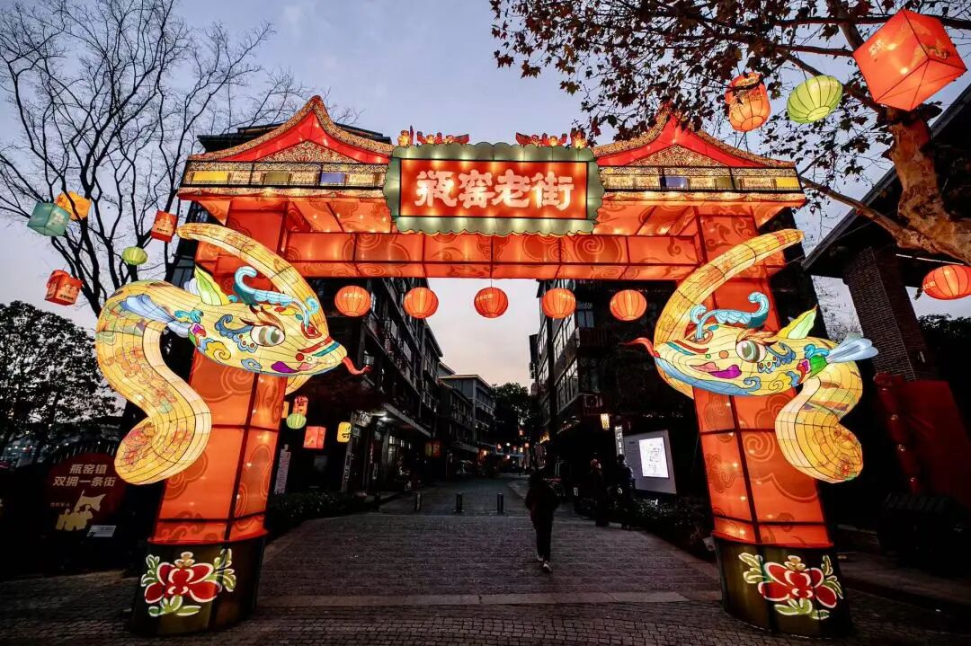 在瓶窑老街的正大门,两条“灵蛇”已经盘旋在门柱上迎客,旁边的千年古城会客厅门口“长”出了“鱼”造型花灯……更有五十余场民俗演出横跨“春节档”。
