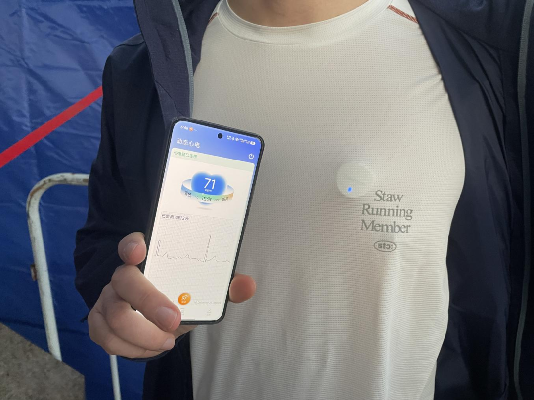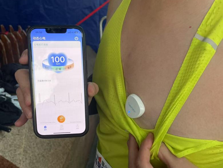 一位跑者分享:“第一次使用这种专业的动态心电监测仪器,体感与贴一片大点的创可贴没有太大区别。而且使用简单,用后即抛,非常方便。”