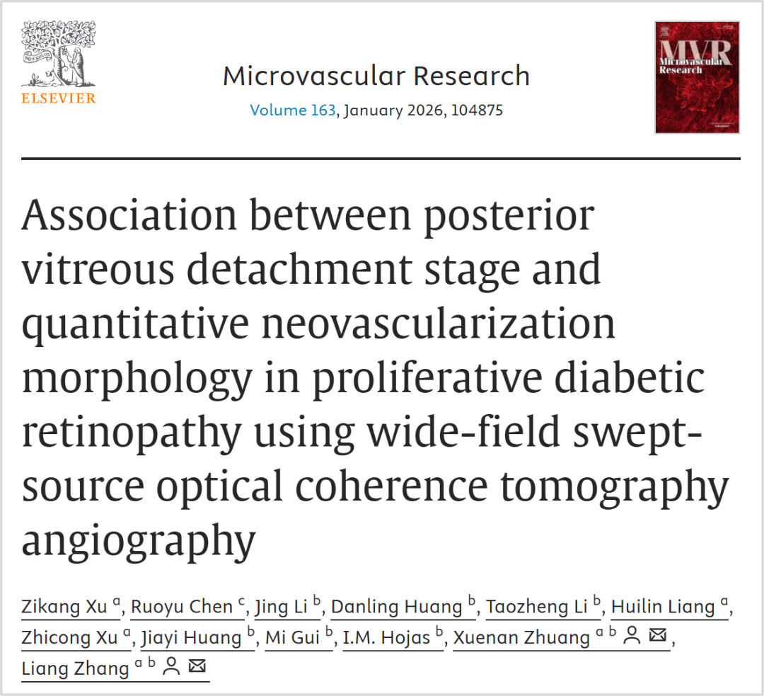 糖尿病增殖性视网膜病变(Proliferative Diabetic Retinopathy, PDR)的核心病理改变是视网膜新生血管(Neovascularization, NV)形成。研究显示,玻璃体后脱离(Posterior Vitreous Detection, PVD)不同阶段与NV形成存在相关性,但PVD各阶段中NV的形态学特征是否有系统性差异尚不明确。传统荧光素血管造影存在局限,而广域扫频光学相干断层扫描血管成像技术(WF SS-OCTA)具备无创、视野广、穿透性强等优势,可清晰可视化NV及视网膜界面结构变化,且与超广角荧光血管造影效果相当,具备形态定量化分析的潜力。尽管OCTA定量分析已应用于多种眼病,但目前尚无研究基于该技术系统分析PDR中全PVD分期下NV形态的动态演变规律。近期,广东省人民医院张良教授团队运用图湃40万速度广域扫频OCTA技术——北溟鲲观察,在《Microvascular Research》发表了标题为《Association between posterior vitreous detachment stage and quantitative neovascularization morphology in proliferative diabetic retinopathy using wide-field swept-source optical coherence tomography angiography》(基于广域扫频光学相干断层扫描血管造影研究增殖性糖尿病视网膜病变中玻璃体后脱离分期与新生血管形态量化的相关性)一项回顾性观察性研究论文(第一作者:徐子康;通讯作者:张良)。本研究探究了PDR中不同PVD分期与NV量化形态特征之间的相关性,系统揭示了NV形态随PVD进程的动态变化。旨在深化PDR发病机制认知,为临床风险分层和治疗策略优化提供新视角。