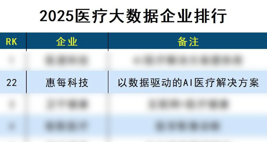 以数据驱动AI医疗!惠每科技入选 2025 医疗大数据企业排行榜