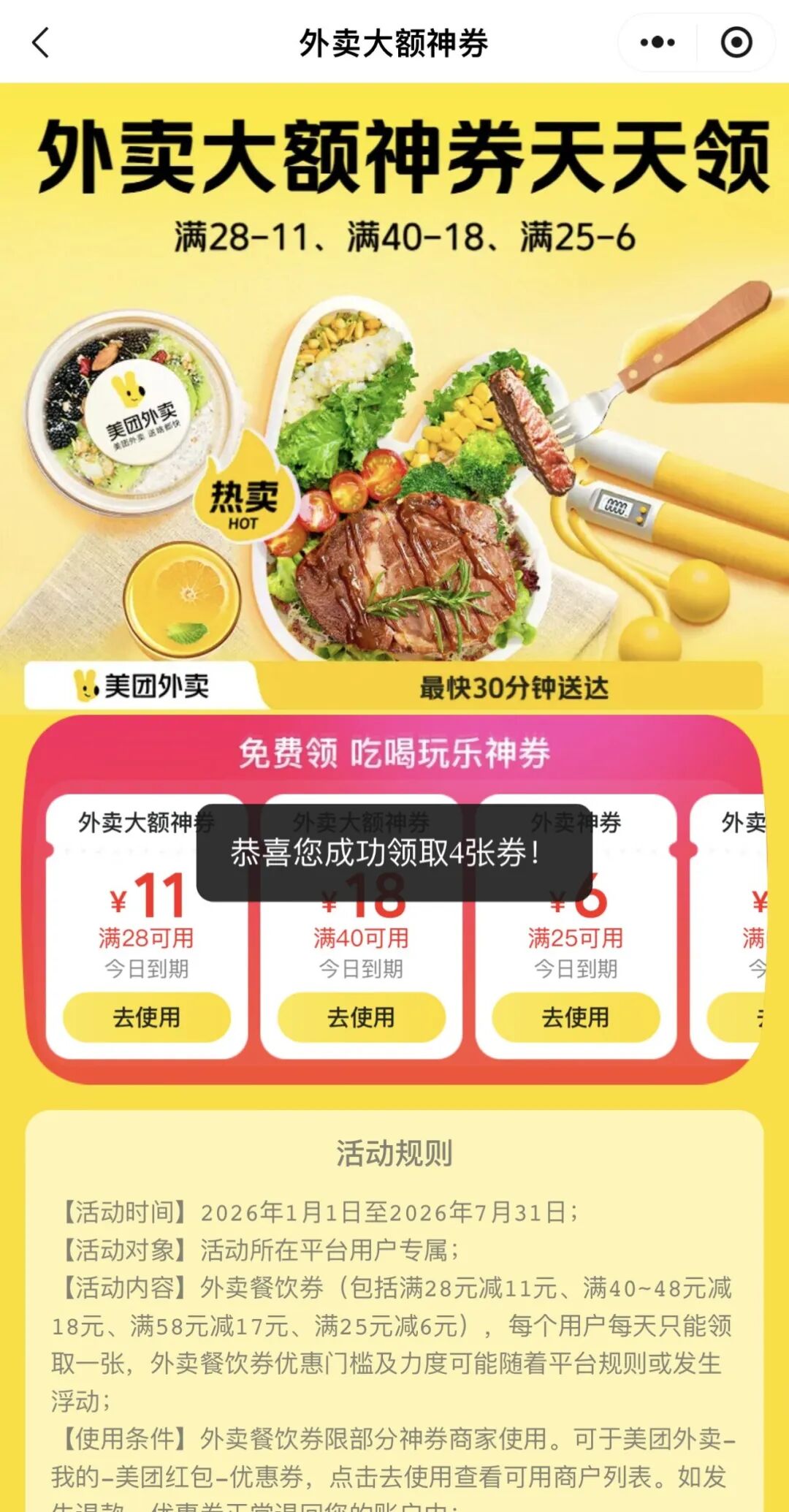 3、点击万达钱包专属美团外卖红包活动页