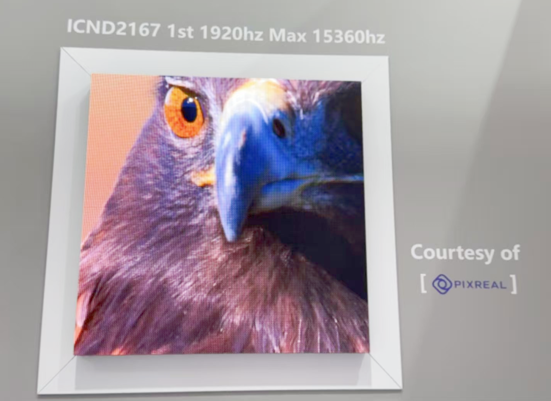 作为本次参展的另一核心重点,高性能恒流输出LED驱动芯片ICND2167凭借卓越的性能参数成为关注焦点。该芯片专为解决Mini/Micro LED小间距显示的画质痛点而设计,支持一级刷新率1920Hz与最大刷新率15360Hz,搭配18bit全灰阶输出,相较于传统驱动IC实现了刷新率、灰度的跨越式升级。其集成的电流精准控制算法,可确保显示产品在动态画面中无拖影、暗场细节更清晰,同时在高亮度运行状态下仍能保持低功耗优势,对高端控制室、虚拟制片等对画质要求严苛的专业场景具备良好的适配性。
