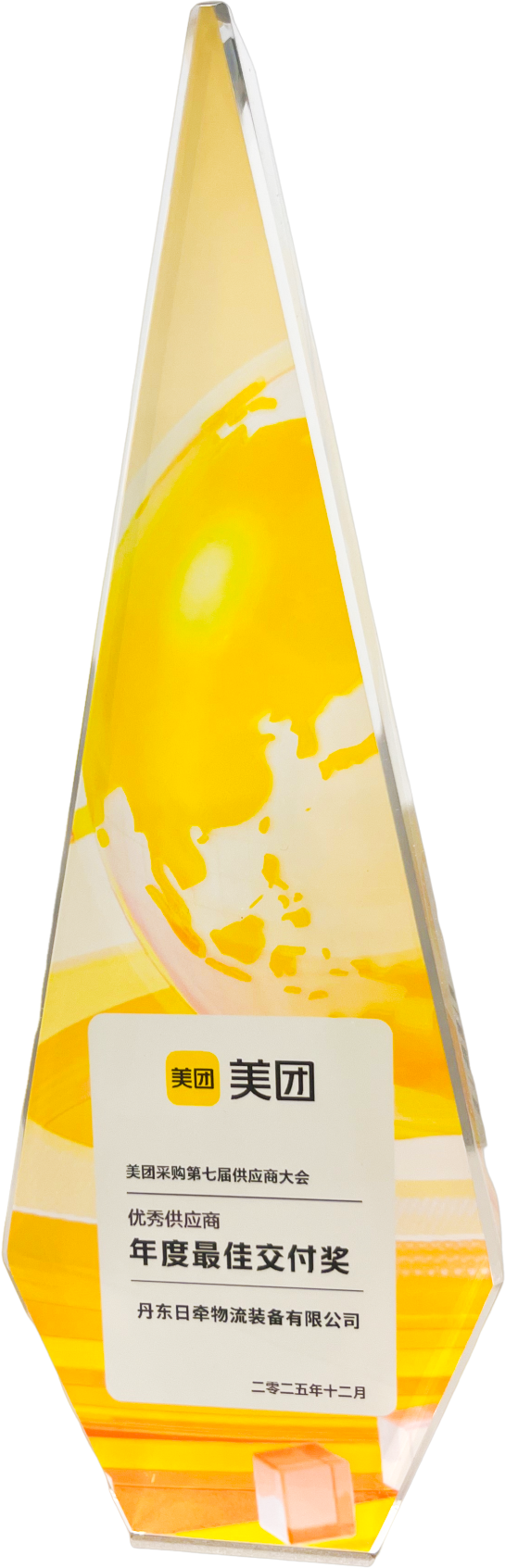 日牵物流装备集团有限公司凭借单元载具的稳定供应与高效交付,从众多供应商中脱颖而出,在“迎新聚力·合作共赢-美团2025年采购第七届供应商大会”上蝉联“年度最佳交付奖”。