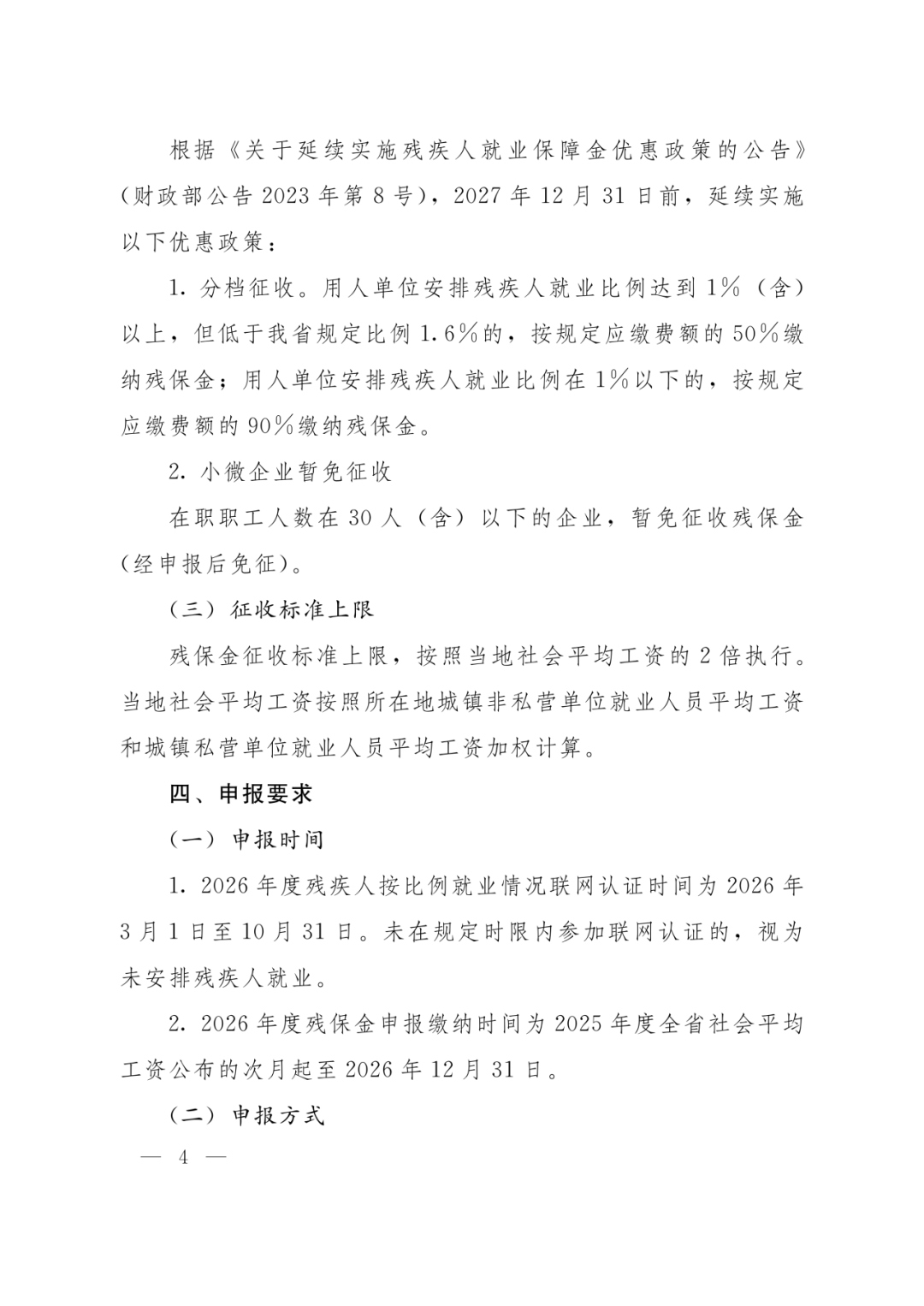 根据《残疾人就业保障金征收使用管理办法》(财税〔2015〕72号)、《关于完善残疾人就业保障金制度 更好促进残疾人就业的总体方案》(发改价格规〔2019〕2015号)、《关于进一步规范残疾人按比例就业情况联网认证工作的通知》(中残就业〔2025〕13号)等文件规定,现将2026年安徽省残疾人按比例就业情况联网认证(以下简称“联网认证”)暨残疾人就业保障金(以下简称“残保金”)申报缴纳工作的有关事项通告如下: