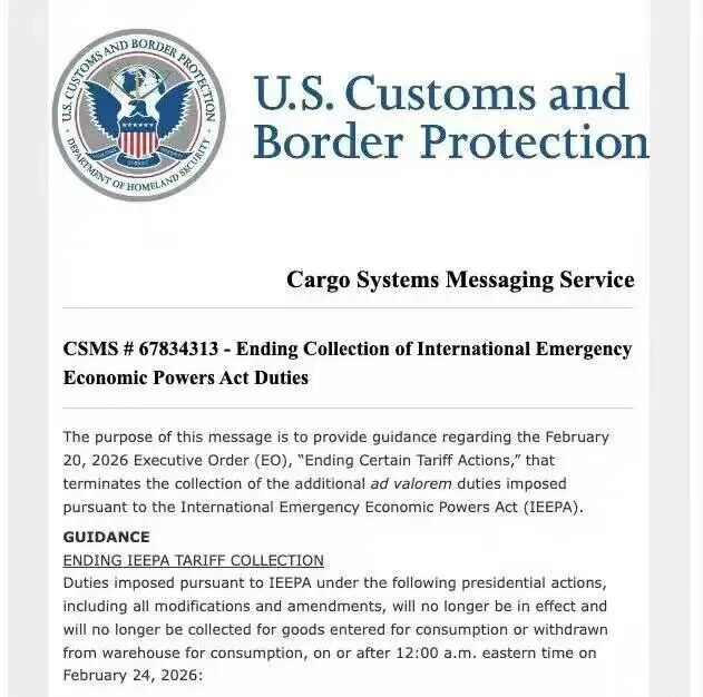美东时间2月23日,美国海关先后发布两个执行指南,宣布自美东时间2026年2月24日(北京时间2026年2月24日下午13:01)起,停止征收根据《国际紧急经济权力法》(IEEPA)开征的关税。同时,美国政府依据第122条款对全球征收的10%临时关税,自24日起正式实施。