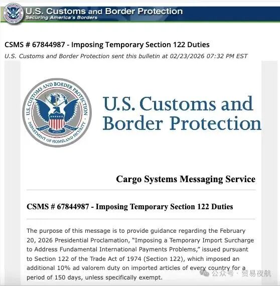 美东时间2026年2月23日晚,美国海关与边境保护局(CBP)正式发布执行指南(CSMS#67844987):已确认并执行特朗普总统于2026年2月20日签署的公告,援引《1974年贸易法》第122条,对几乎所有来自全球的进口商品额外征收10%的临时从价关税。