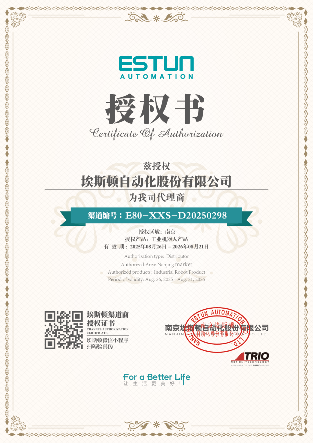 所有信息均来自埃斯顿官方数据库,确保真实可靠。若显示“授权已失效”或“信息不存在”,建议您及时联系埃斯顿渠道管理部(channel@estun.com)进一步核实。