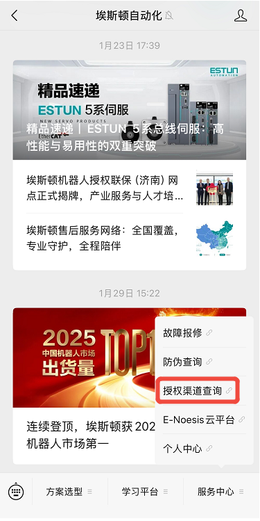 关注“埃斯顿自动化”微信公众号,在后台菜单栏依次进入【服务中心】→【授权渠道查询】,输入对应的“渠道商名称”和“渠道授权码”即可查验授权信息。